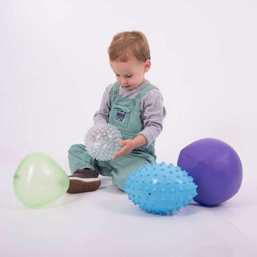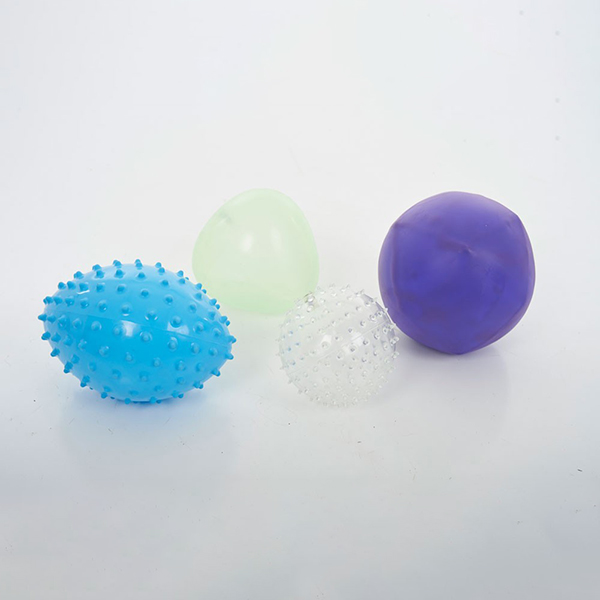 Set contains: blue opaque rugby ball (L:250mm), green semi-translucent pyramid ball (L:180mm), purple opaque mulit-sided ball (dia. 220mm) and clear spiky surface ball (dia. 150mm)